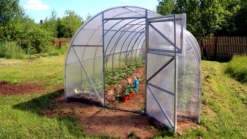 The greenhouse is designed for growing garden crops. There is a door with an air window at both ends of the greenhouse. The frame of the greenhouse is made of galvanized steel and is assembled using screws. To attach the frame to the ground, special T-shaped frame ends are used, which are dug into the ground or screwed to the base frame made of wood. The covering material is UV-resistant 4 mm polycarbonate, which has a 10-year warranty.