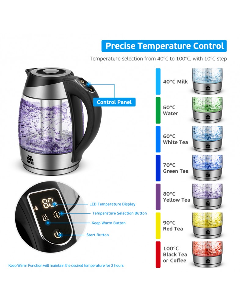 This model can change the colors of the LED lighting depending on the water temperature. Temperature can be set from 40 to 100℃, with 10℃ steps. When the kettle heats the water, the LED lighting changes color 7 times, in the following sequence: white, green, light blue, blue, purple, yellow and red.